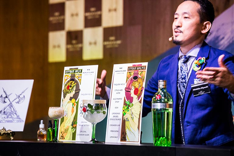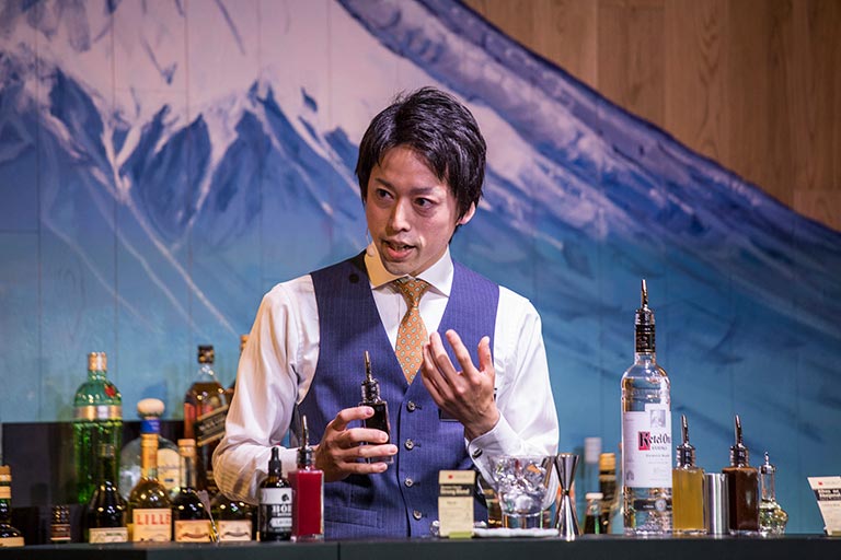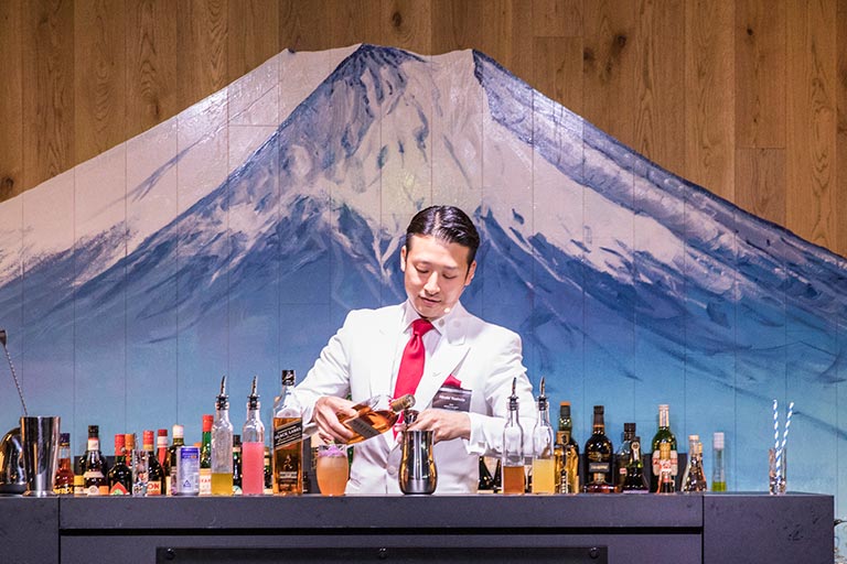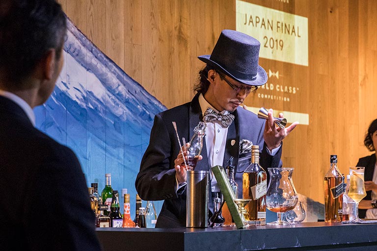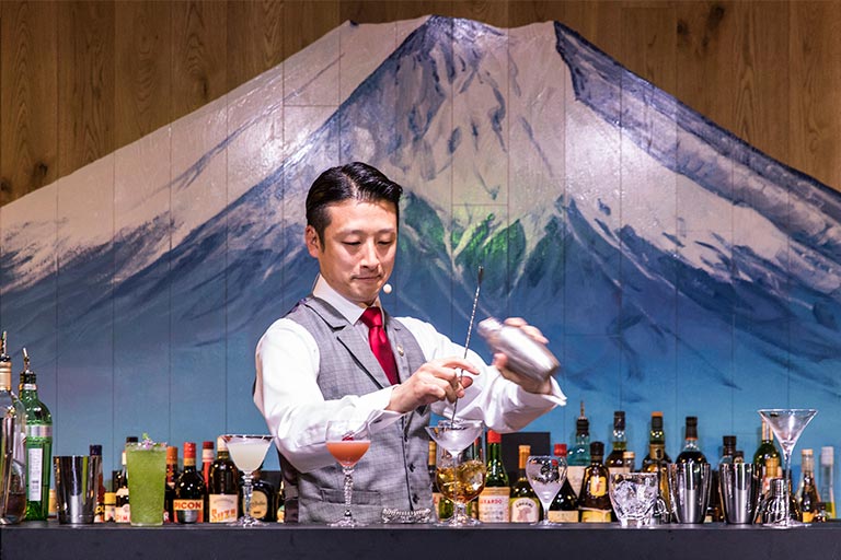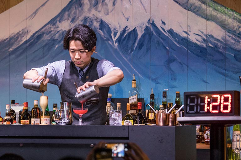 「DIAGEO WORLD CLASS」は、カクテルの味わいのみならず、バーテンダー自身のクリエイティビティ、ホスピタリティ、情熱を重視している、世界最大級※の“バーテンダーコンペティション”。今年のGLOBAL FINALの舞台はスコットランド・グラスゴー。その世界大会へのたった1枚の切符を賭けて、2月から始まった日本大会を勝ち抜いてきた10名のファイナリストが7月3日・4日の2日間、闘いを繰り広げた。※ ディアジオ社調べ会場となった銀座PLUSTOKYOでは、壁一面に富士山が描かれ、まさに日本一を決定するにふさわしいステージが用意された。今年で11回目を迎えたジャパンファイナルだが、年々バーテンダーの存在は広く認知されるようになり、その中で新しいムーブメントも生まれ、バー業界は一層盛り上がりを見せている。その影響もあってか、今年のファイナリストは、実力に定評のある選手と初参戦の選手の、新旧入り混じった豪華な顔ぶれとなった。