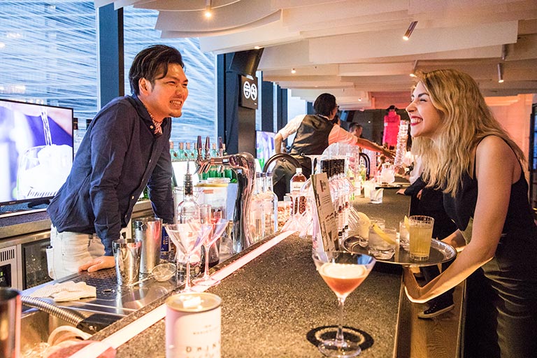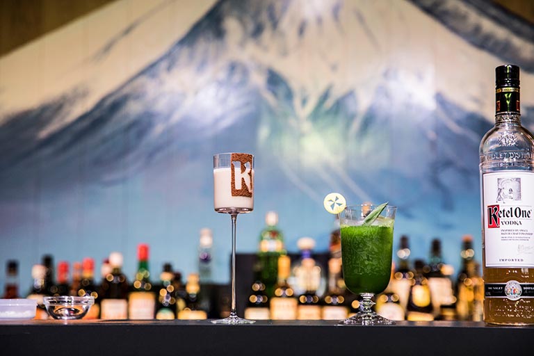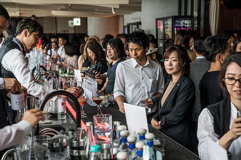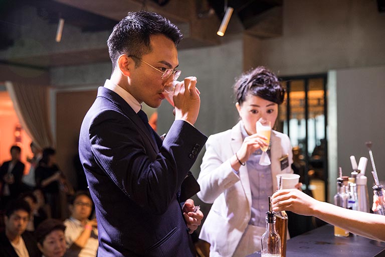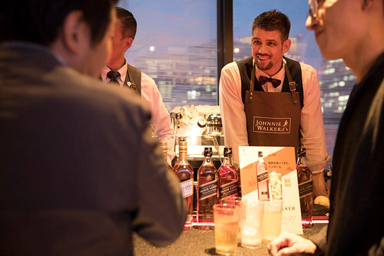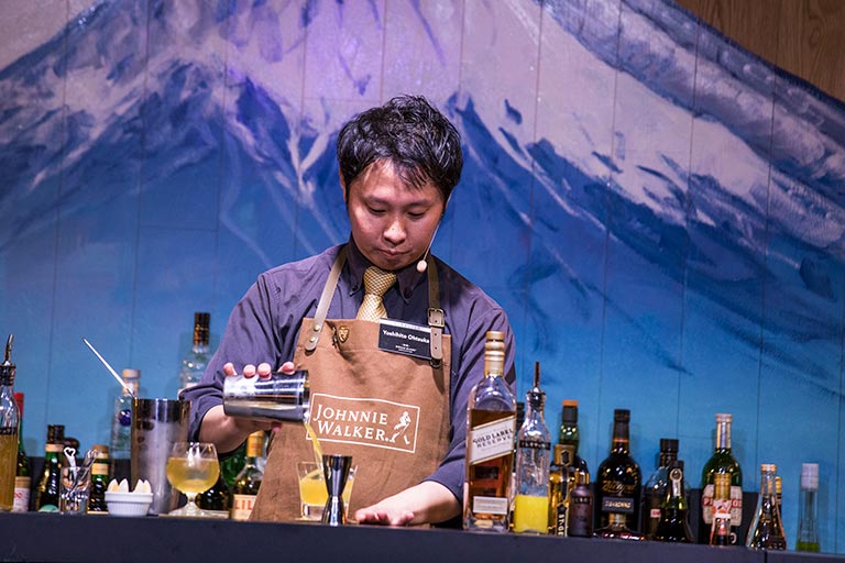 会場を入るとひときわ目を引く15mを超えるロングバーには、ディアジオの4つのブランドのスピリッツが並ぶ。そこでは、来場客がディアジオブランドを体感できるよう、ワールドクラスのバーテンダーたちが、それぞれの特長を活かした海外で流行しているカクテルを作り、会場を多いに盛り上げた。