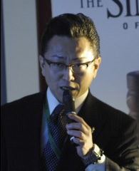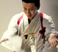 浴衣にタスキがけで颯爽と登場したのは大竹 学氏。世界大会で着用したもので、タスキの赤は日の丸をイメージしています。本番同様20分の制限時間を設け、「Theatre and Stars Challenge」のデモを開始。