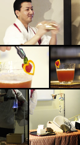 まずは“ディーバ”と呼ばれる女性スターをモチーフにしたカクテルサーブから。大竹氏は震災後の日本を勇気づけたシンディー・ローパーの魅力を表現。「スパイスの効いたワクワクした香りが彼女に通じる」と、ロン サカパ(ラム)をベースに選び、畳のコースターやハート型のガーニッシュなども用いたチャーミングな一杯を完成させました。