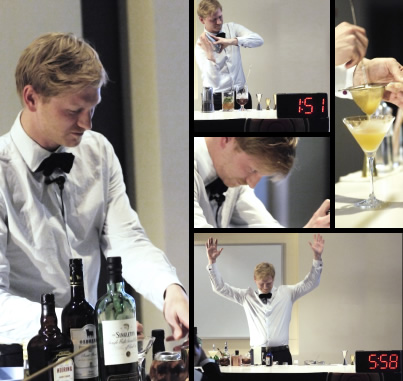 ジェイミー・マクドナルド氏は「Cocktails Against the Clock」「Asian Food Matching Challenge」を再現して鮮やかにパフォーマンス。前者はわずか6分で3〜5種のカクテルを仕上げるチャレンジ。スピードはもちろんですが、不慣れな場所でも一つひとつの手順をきちんとこなすことが求められます。氏は「なるべく両手を使うのがコツ」と言いながら、3種のクラシックカクテルに加えて「アプリコットとミントのジュレップ」など2種のツイストカクテルを仕上げ、世界3位の貫禄を見せつけました。